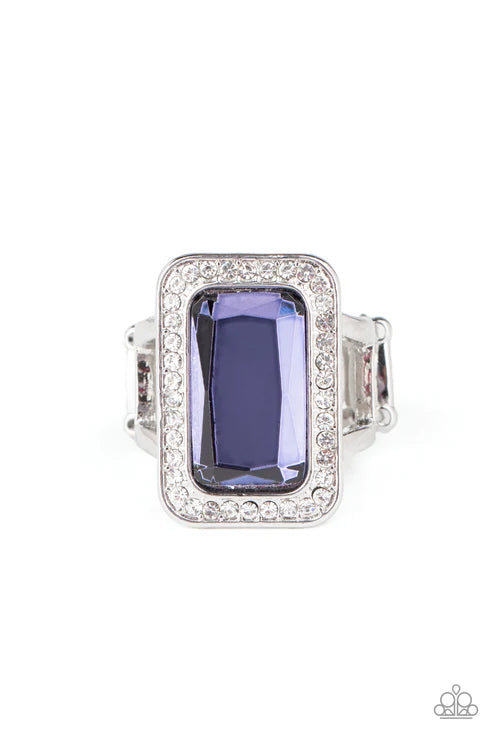 Featuring a regal emerald style cut, an oversized purple gem is bordered by a silver frame encrusted in glassy white rhinestones for a glamorous look. Features a stretchy a band for a flexible fit.