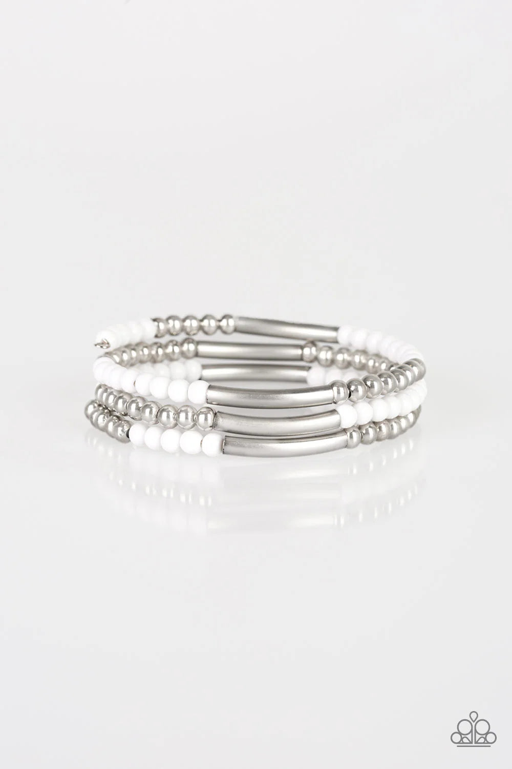 A collection of refreshing white beads and shiny silver accents are threaded along a long wire to create an infinity wrap bracelet. Coil design allows for an adjustable fit.
