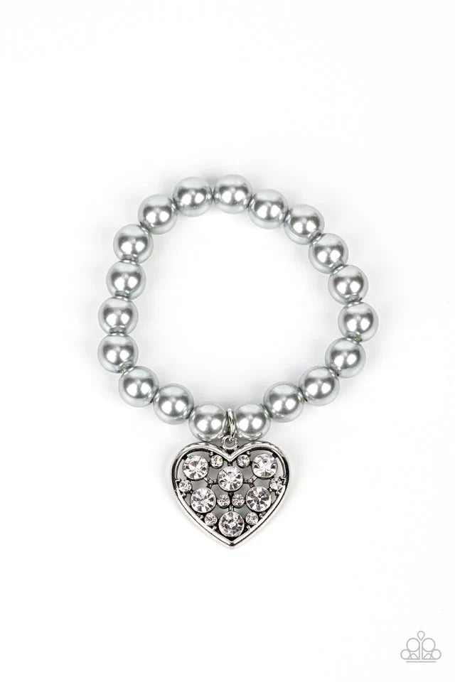 A dramatically oversized white rhinestone encrusted silver heart charm dangles from a stretchy strand of bubbly silver pearls, creating a flirtatious dazzle.