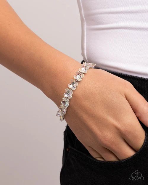 Iridescent acrylic flowers are linked along a silver chain, creating a glimmering floral display around the wrist. Features an adjustable clasp closure.