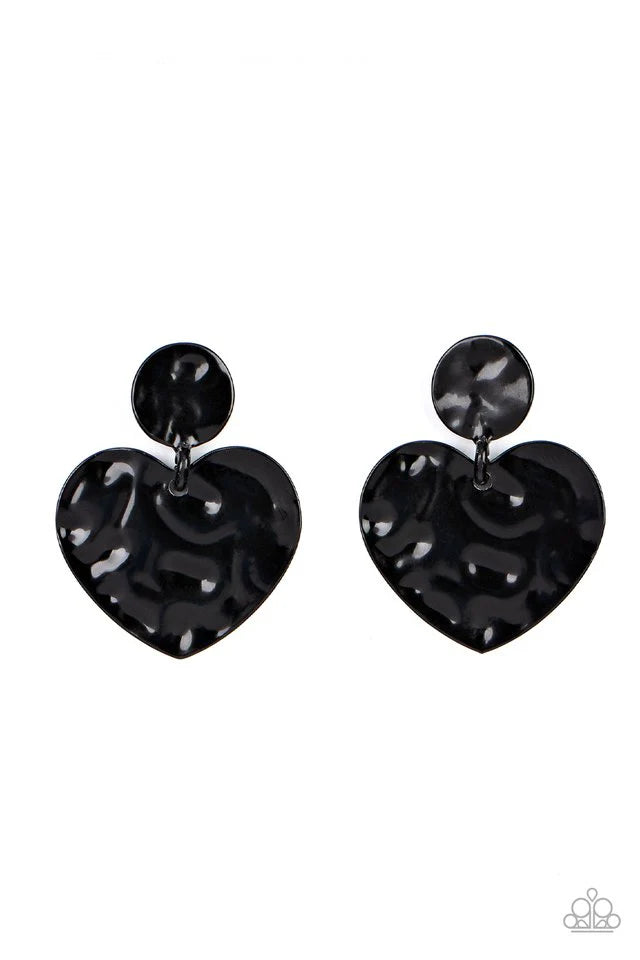 Painted in a glossy black finish, a hammered disc gives way to a hammered heart frame for a flirtatious fashion. Earring attaches to a standard post fitting.